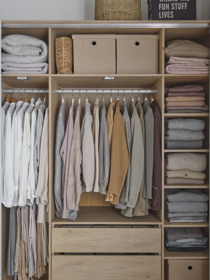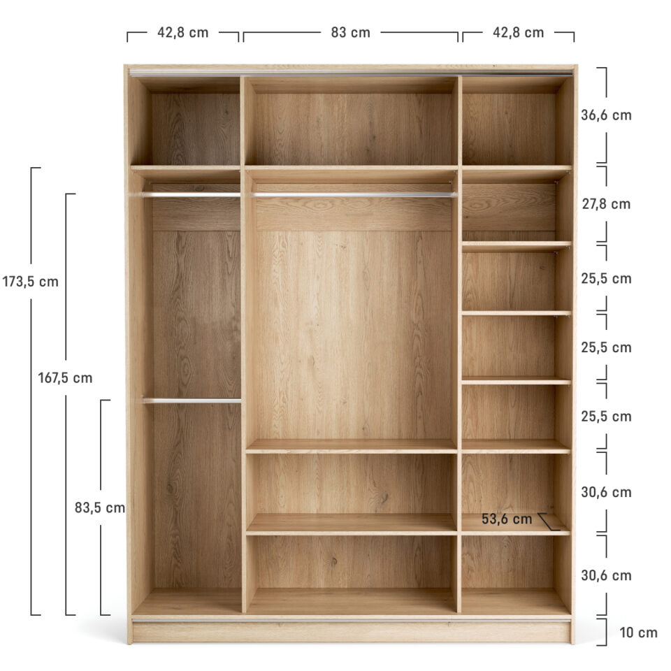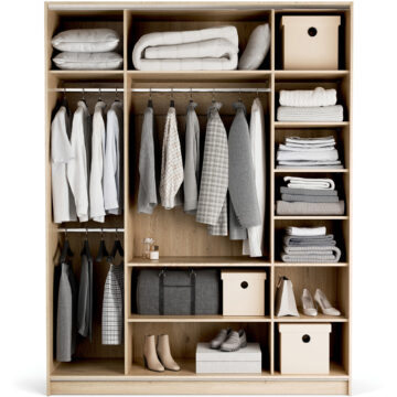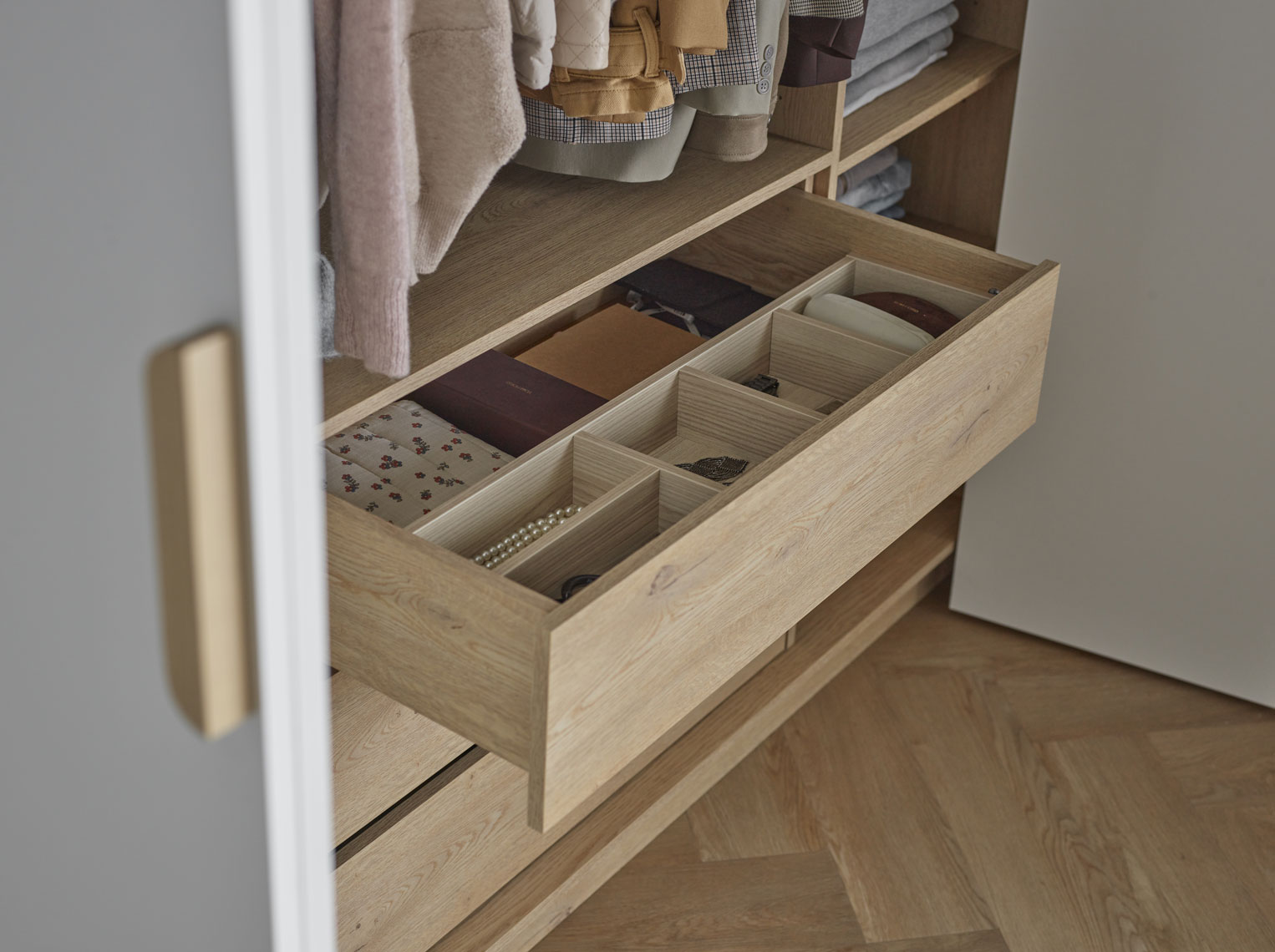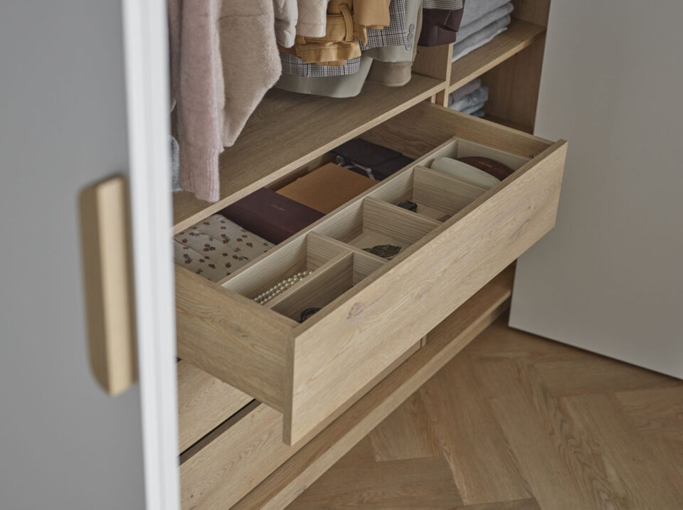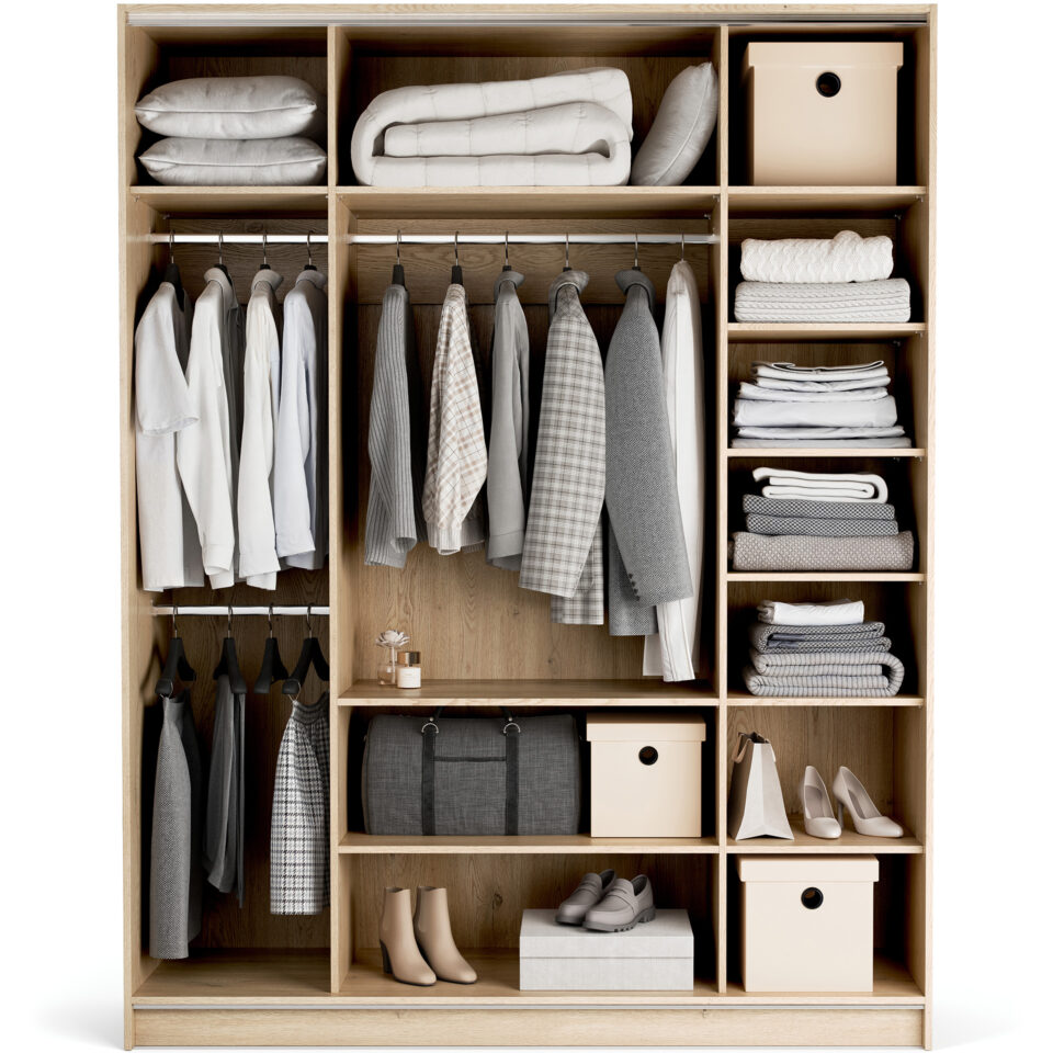 Comfort: 3 fiksne police, 2 obešalni palici, izvlečno držalo za hlače, 5 nastavljivih polic v desnem delu ter sredinski predalnik s 3 predali za shranjevanje perila in dodatkov.