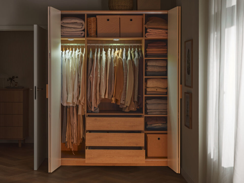 V notranjosti so LED lučke s senzorjem gibanja, ki se ob odpiranju samodejno prižgejo, kar omogoča jemanje oblačil brez prižiganja glavne luči.