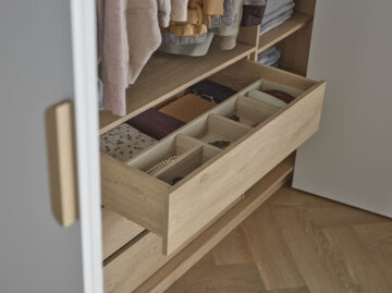 Notranjost lahko dopolnite z dodatnimi policami ali kovinskim obešalnikom za dodatke. Omaro je možno razširiti tudi z bočno omaro, ki poveča prostor za shranjevanje; izbira kontrastne barve pa ustvari zanimiv vizualni učinek.