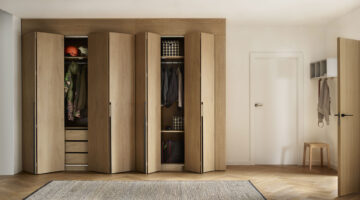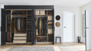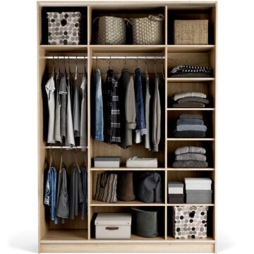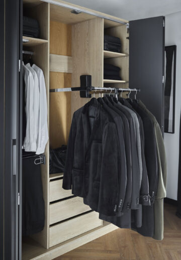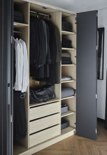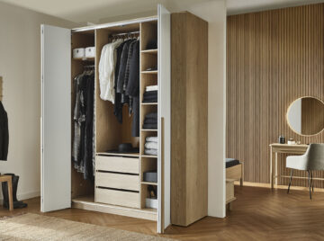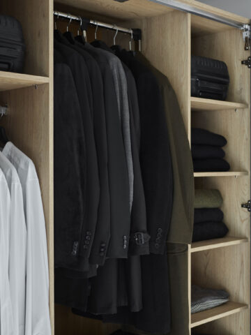 Prostorna garderobna omara Stor lahko v celoti nadomesti klasično samostojno omaro ter olajša organizacijo oblačil in dodatkov. Odlično se prilega spalnici ali predsobi ter se prilagaja spreminjajočim se potrebam gospodinjstva. Zložljivo-drsna vrata omogočajo enostavno in hitro pripravo na odhod, vgrajena LED osvetlitev pa po zaslugi senzorja gibanja razkrije celotno notranjost tudi v temi. Notranjost omare je mogoče prilagoditi individualnim potrebam in jo po želji razširiti s stransko omaro za še več prostora.