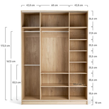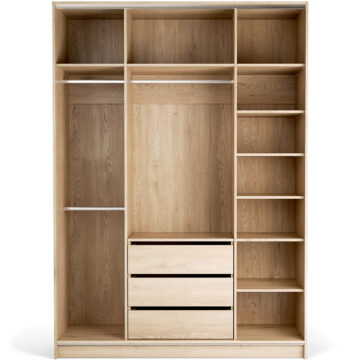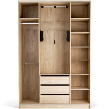 Comfort: 3 zgornje fiksne police, 3 obešalne gredi, 5 nastavljivih polic v desnem segmentu ter predalnik s 3 predali v srednjem.