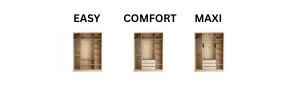 - Maxi: levo – fiksna polica, obešalna palica in izvlečno stojalo za hlače; sredinsko – spuščena obešalna palica in podstavek s 3 predali; desno – fiksna polica ter 5 nastavljivih polic.