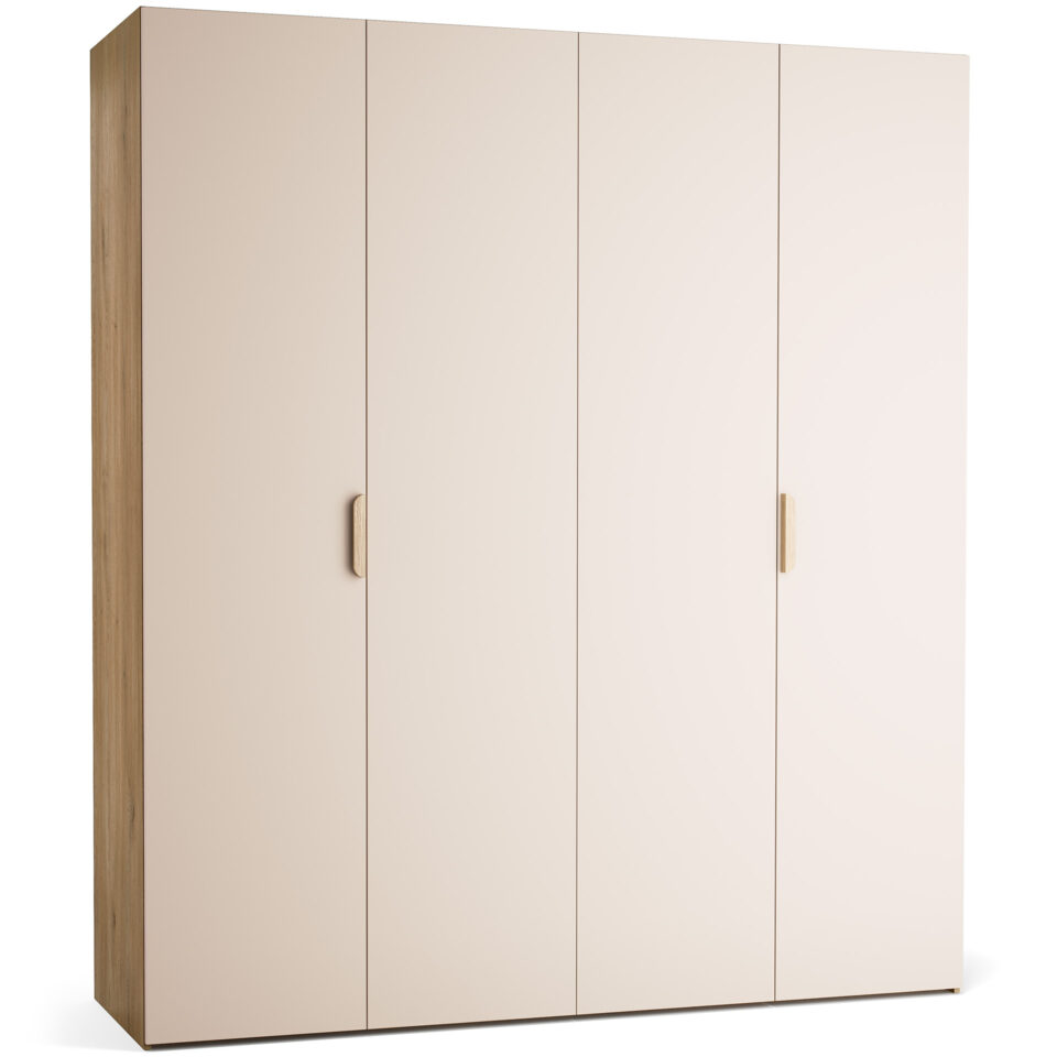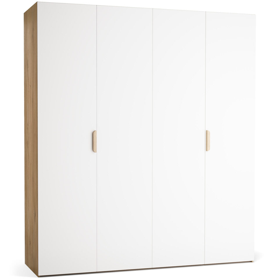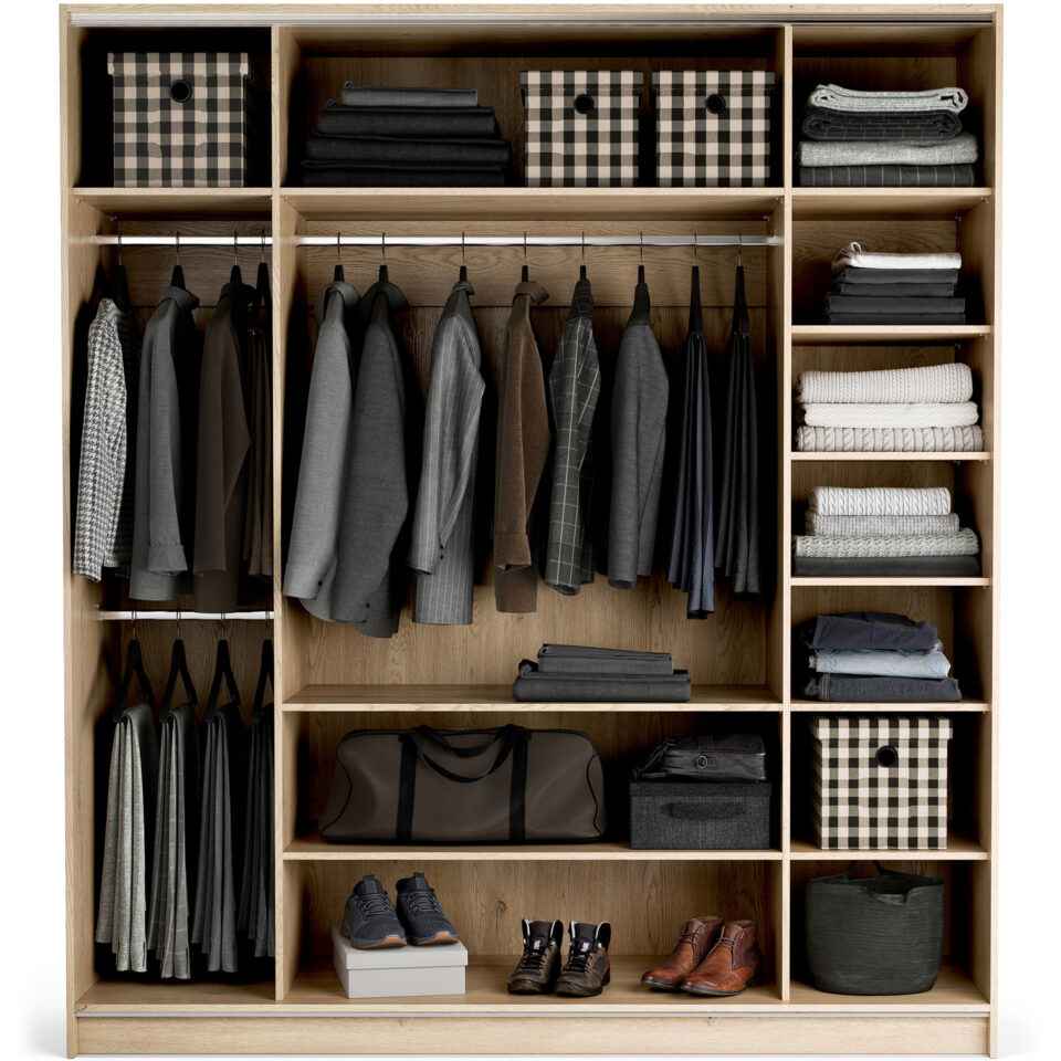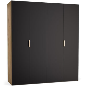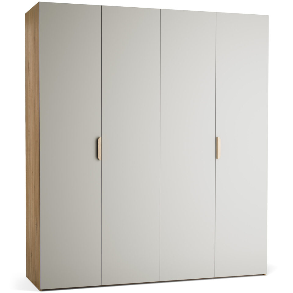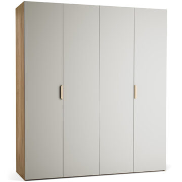 Veliki, 4-vratni model garderobne omare Stor lahko prevzame vlogo polnovredne garderobe za dva odrasla. Za drsno-zložljivimi vrati se skriva prostorna notranjost, ki jo je mogoče opremiti z enim izmed pripravljenih paketov ali pa dopolniti z dodatnimi elementi po lastni izbiri. Priložena LED osvetlitev omogoča lažje jemanje oblačil po temi, možnost personalizacije pa zagotavlja, da se omara popolnoma prilega prostoru in okusu uporabnika. Z dodatkom maskirnih panelov lahko ustvarite videz vgradne omare brez čakanja na naročilo pri mizarju.