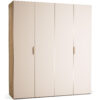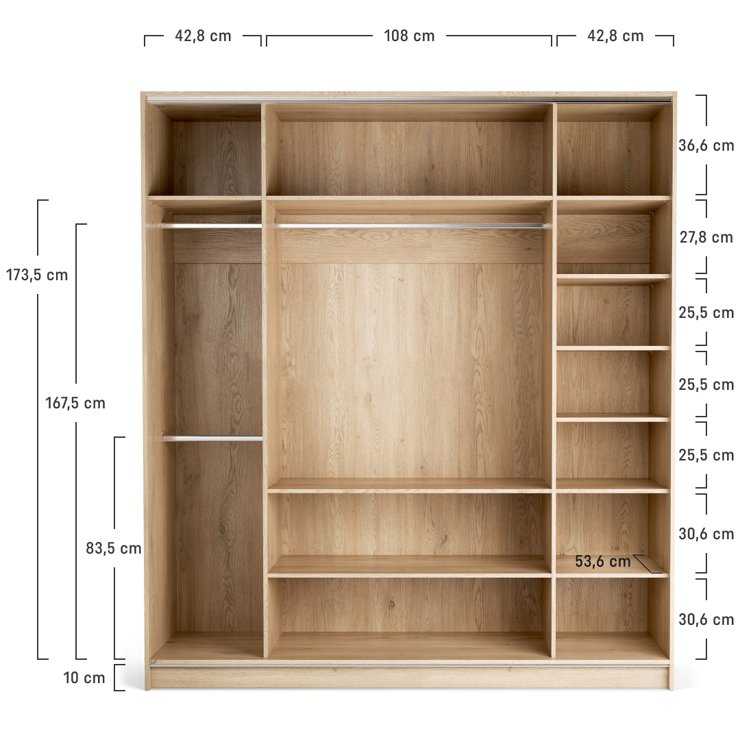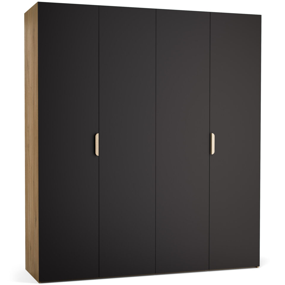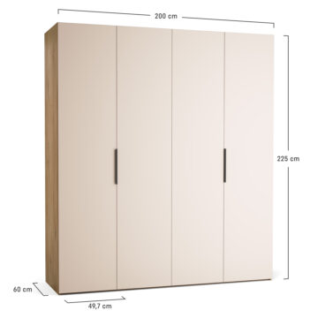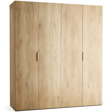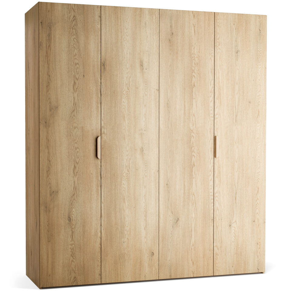Veliki, 4-vratni model garderobne omare Stor lahko prevzame vlogo polnovredne garderobe za dva odrasla. Za drsno-zložljivimi vrati se skriva prostorna notranjost, ki jo je mogoče opremiti z enim izmed pripravljenih paketov ali pa dopolniti z dodatnimi elementi po lastni izbiri. Priložena LED osvetlitev omogoča lažje jemanje oblačil po temi, možnost personalizacije pa zagotavlja, da se omara popolnoma prilega prostoru in okusu uporabnika. Z dodatkom maskirnih panelov lahko ustvarite videz vgradne omare brez čakanja na naročilo pri mizarju.
