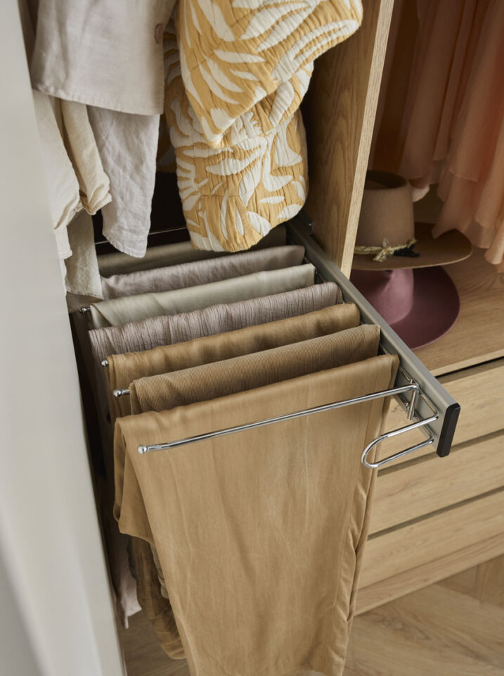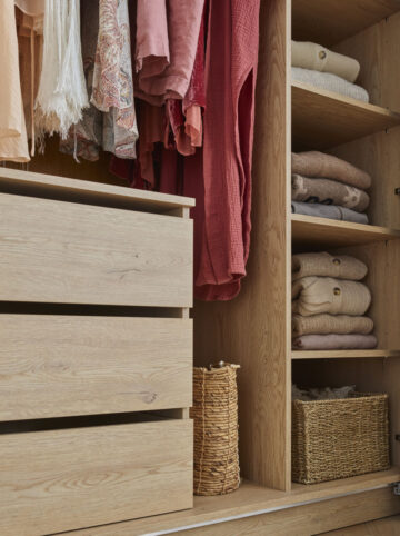 Comfort: 3 zgornje fiksne police, 5 nastavljivih polic v desnem segmentu, 3 obešalne gredi ter predalnik s 3 prostornimi predali za perilo in dodatke, ki ga je možno namestiti na levo ali desno stran. Prostor ob njem omogoča shranjevanje daljših oblačil ali večjih predmetov, kot je likalna deska.