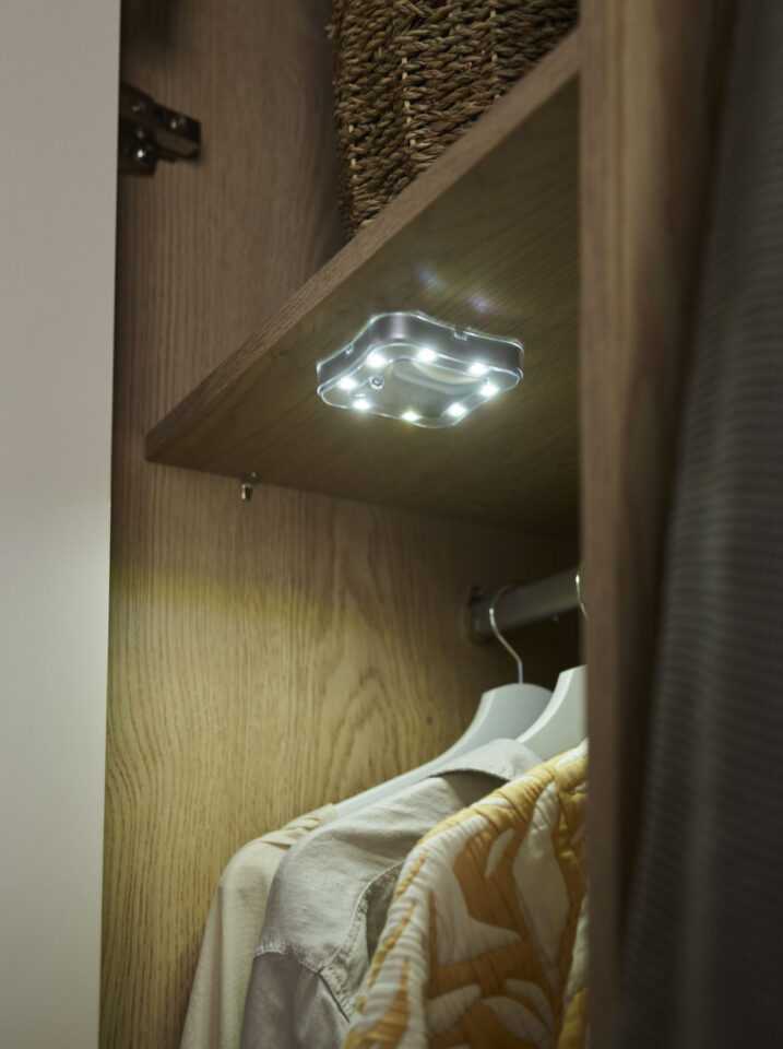 V notranjosti so LED lučke s senzorjem gibanja, ki se ob odpiranju samodejno prižgejo, kar omogoča jemanje oblačil brez prižiganja glavne luči.