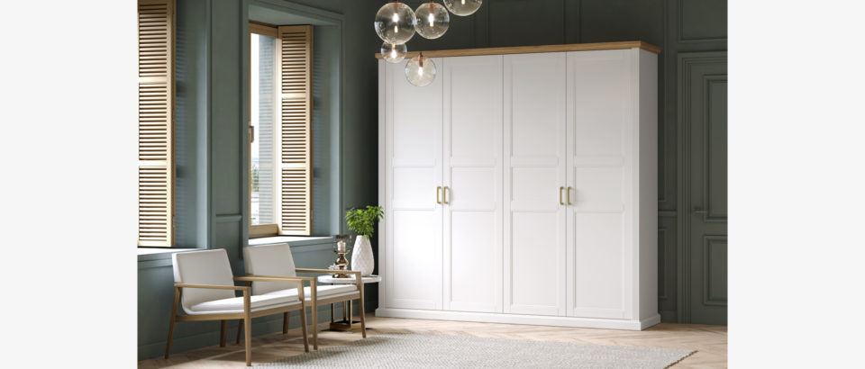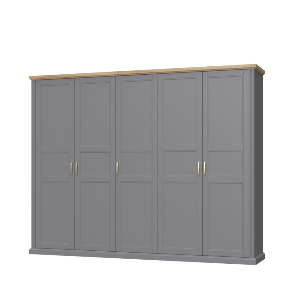 Ne glede na to ali ste ljubitelj klasičnega/ modnega sloga pohištva bo spalnica Tara poskrbela za efekt elegance in brezčasnosti. Spalnica Tara je oblikovana na način, ki nikoli ne gre iz mode. Garderobno omaro lahko izbirate v grafit sivi ali beli barvi z dodatkom barve pacifik oreha. Lakirana je z UV mat lakom na vodni bazi. Strop, dno in fronte elementov so iz mediapana. Vsa vrata imajo mehanizem mehkega zapiranja. Dimenzija omare: Š 291 X V 227 X G 59 cm
