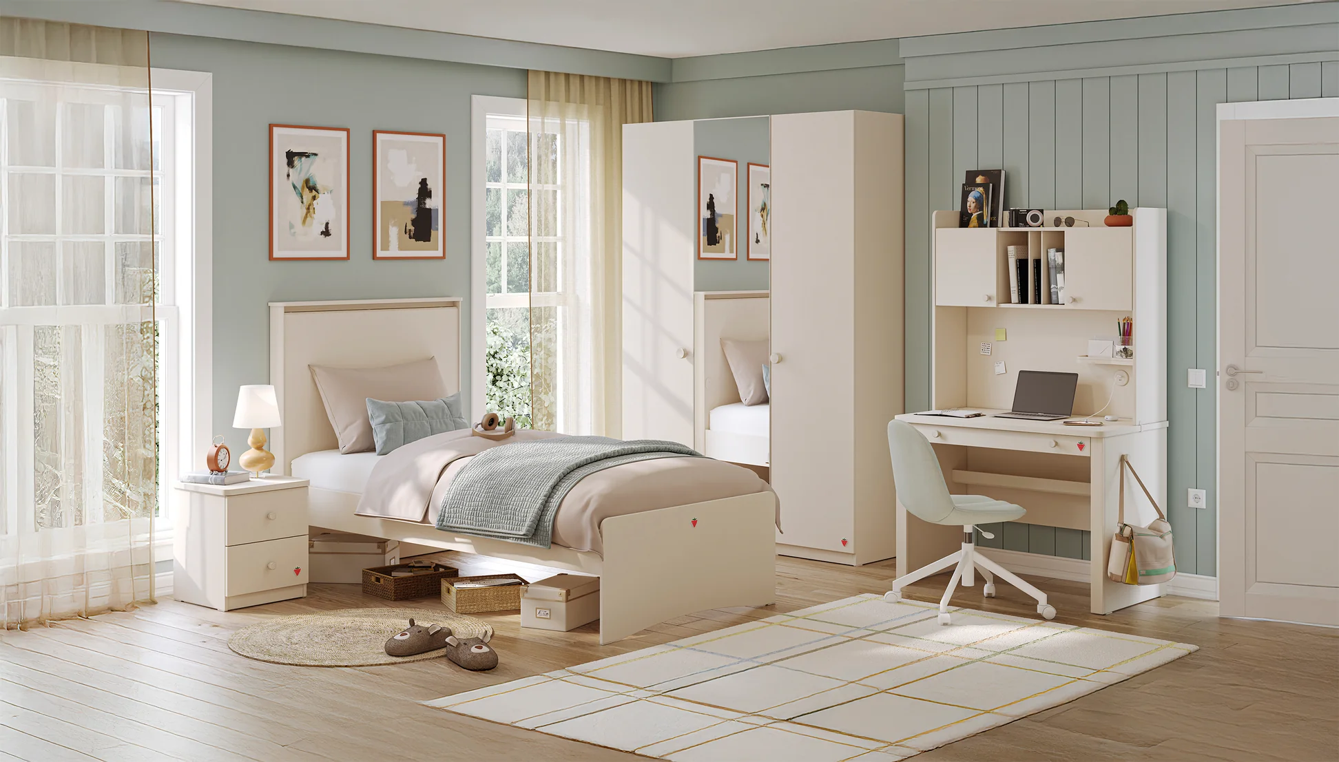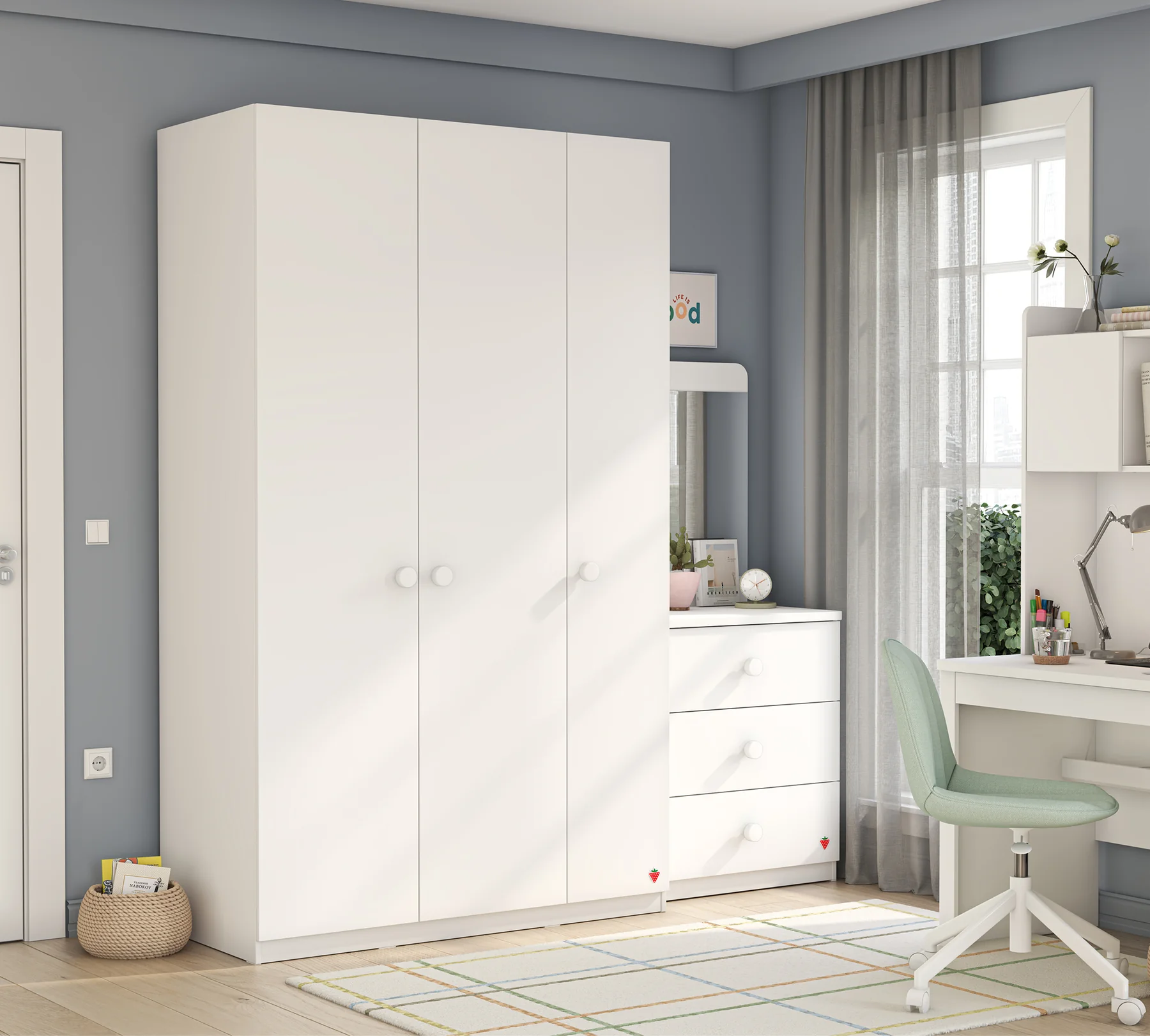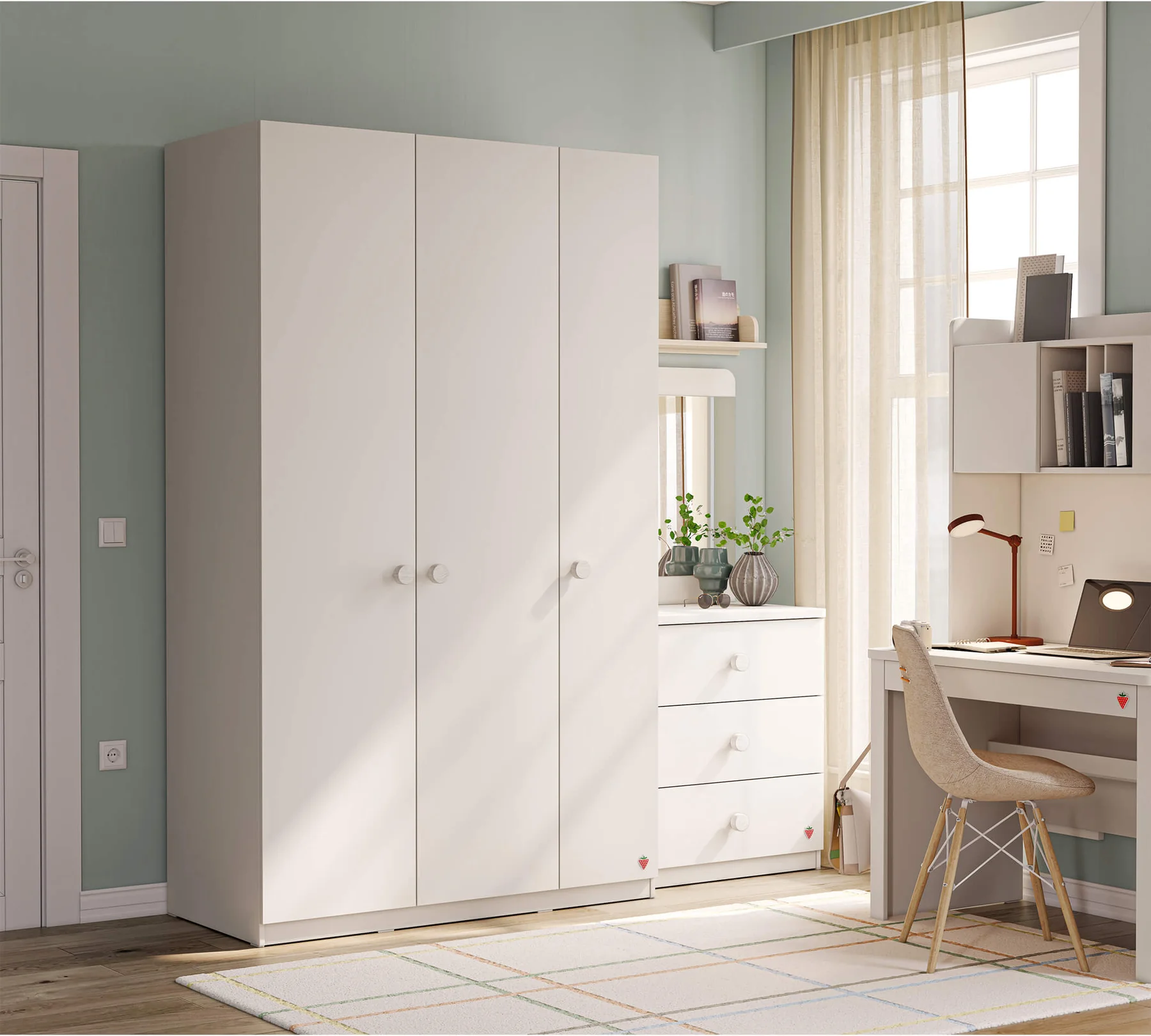 Številne police in prostor za obešanje vam pomagajo organizirati vaše stvari tako, da jih razvrstite v kategorije. Tečaji z mehkim zapiranjem zagotavljajo tiho in varno delovanje, elegantni leseni ročaji pa dodajo naraven pridih. Varnostna naprava preprečuje prevračanje in zagotavlja brezskrbnost. Minimalistične linije dodajo vaši sobi eleganten pridih.