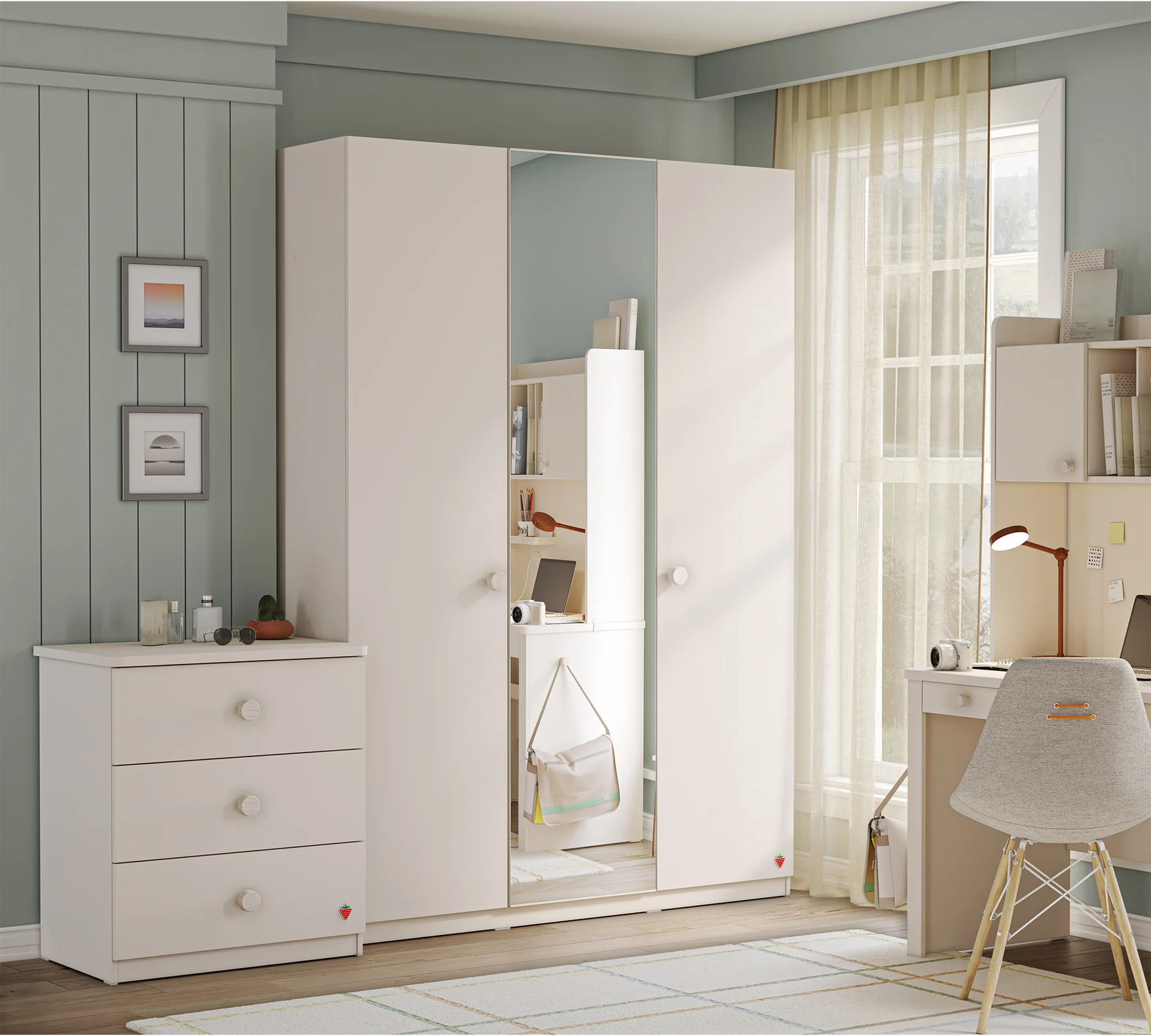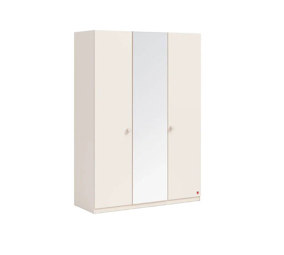 Garderobna omara Varia ima kar troje vrat ki se mehko zapirajo. Ogledalo je nameščeno na sredinskih vratih. Ročaji so leseni in so zaobljeni. V notranjosti omare je obešalnik z led svetilko in številne police, zato zagotavlja dovolj prostora za vsa oblačila. S čistimi linijami in naravnim izgledom je primerna za vsako sobo. Zaščitena je z melaminom, ki ščiti pred praskami in prahom.