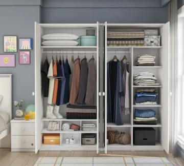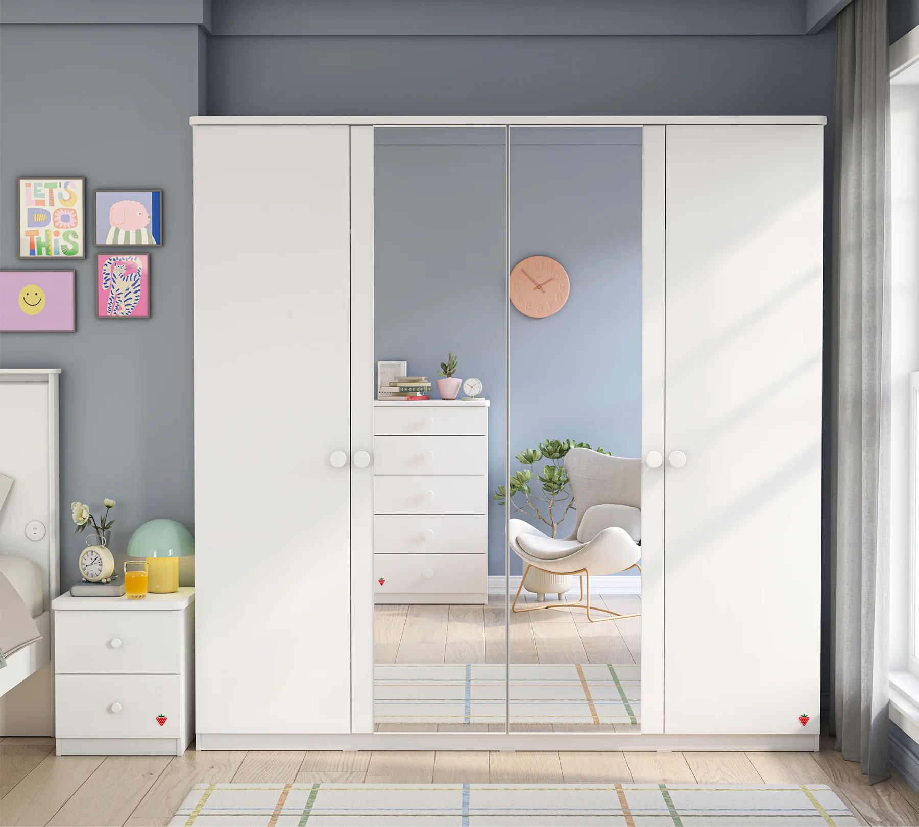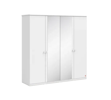 Garderobna omara Varia ima kar štiri vrata ki se mehko zapirajo. Ogledalo je nameščeno na sredinskih vratih. Ročaji so leseni in so zaobljeni. V notranjosti omare je obešalnik z led svetilko in številne police, zato zagotavlja dovolj prostora za vsa oblačila. S čistimi linijami in naravnim izgledom je primerna za vsako sobo. Zaščitena je z melaminom, ki ščiti pred praskami in prahom.