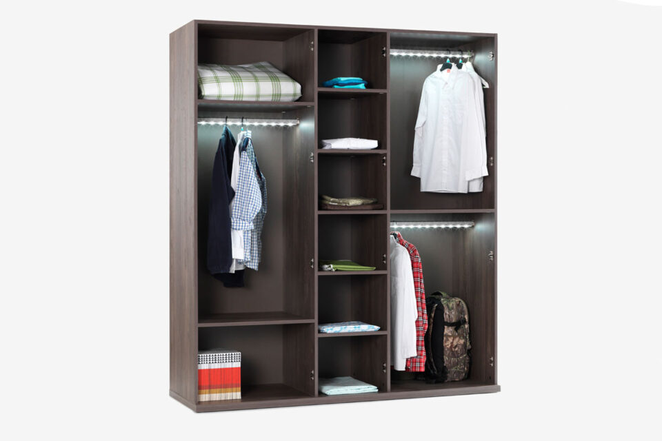 Shranjevalne rešitve: Omara vključuje osem polic in tri obešalne droge, kar omogoča raznolike možnosti organizacije oblačil in dodatkov. LED osvetlitev notranjosti omare dodaja praktično razsvetljavo in poudarja predmete shranjene v omari.