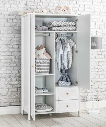 Elegantna garderobna omara Victoria je eden izmed osrednjih kosov istoimenskega pohištvenega sestava. Odlikuje se z brezčasnim dizajnom. Za shranjevanje ima veliko polic in dva predala na sistem mehkega zapiranja. Izdelana je iz oplemenitene iverne plošče E1 kakovosti, debeline 18 mm. Ročaji so kovinski, obešalna palica ima LED svetilo, ki se prižiga na senzor.
