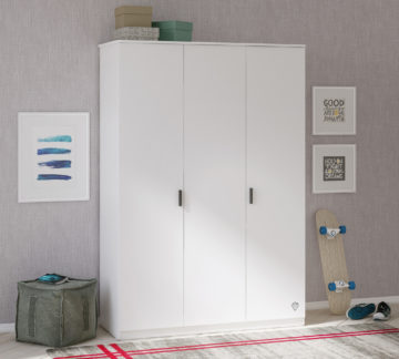 Garderobna omara White je sestavljena iz treh vrat, ki se mehko zapirajo. Za dvemi se nahajajo police in obešalnik. Za drugimi vrati pa so dodatne police, ki so poljubno nastavljive po višini. Na voljo je v beli barvi. Zaščitena je z melaminom, ki ščiti pred praskami in prahom.