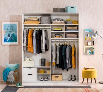 Garderobna omara White je na voljo v beli barvi in ima drsna vrata. V notranjosti omare se nahajata dva predala, dva obešalnika in številne police. Obešalnika sta opremljena z lučjo. Zaščitena je z melaminom, ki ščiti pred praskami in prahom.