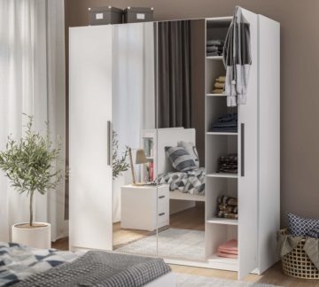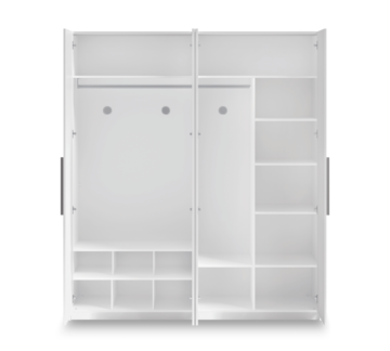 Garderobna omara White ima štiri vrata, ki se mehko zapirajo. Na dveh vratih ima dodana ogledala. Obogatena je s sivimi ročaji. Vlaga se v omari ne more pojaviti zaradi prezračevalne kapsule v notranjosti. V notranjosti sta dva obešalnika in številne police. Na voljo je v beli barvi. Zaščitena je z melaminom, ki ščiti pred praskami in prahom.