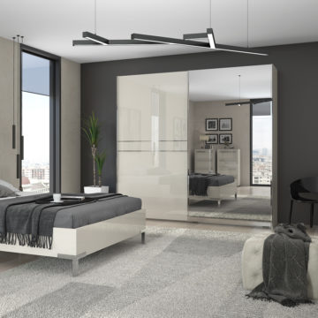 Garderobna omara z drsnimi vrati za katerimi je dvanajst polic in štirje obešalni drogi. Korpus omare lahko izbirate v bež lak ali beli lak barvi. Vrata imajo mehanizem mehkega zapiranja in ogledalo. Garderobna omara je del sestavnega programa spalnic Piano.
