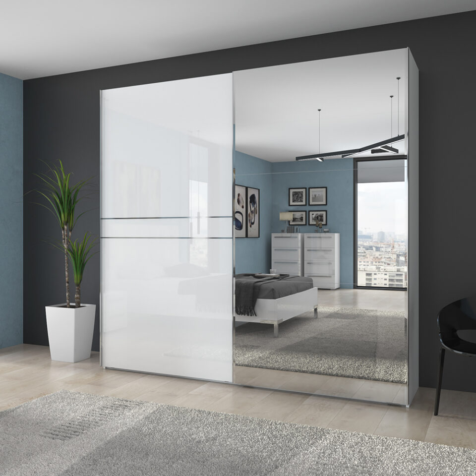 Garderobna omara z drsnimi vrati za katerimi je dvanajst polic in štirje obešalni drogi. Korpus omare lahko izbirate v bež lak ali beli lak barvi. Vrata imajo mehanizem mehkega zapiranja in ogledalo. Garderobna omara je del sestavnega programa spalnic Piano.
