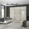 Garderobna omara z drsnimi vrati za katerimi je devet polic in trije obešalni drogi. Korpus omare lahko izbirate v bež lak ali beli lak barvi. Vrata imajo mehanizem mehkega zapiranja. Garderobna omara je del sestavnega programa spalnic Piano.