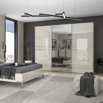 Garderobna omara z drsnimi vrati za katerimi je devet polic in trije obešalni drogi. Korpus omare lahko izbirate v bež lak ali beli lak barvi. Vrata imajo mehanizem mehkega zapiranja in ogledalo. Garderobna omara je del sestavnega programa spalnic Piano.