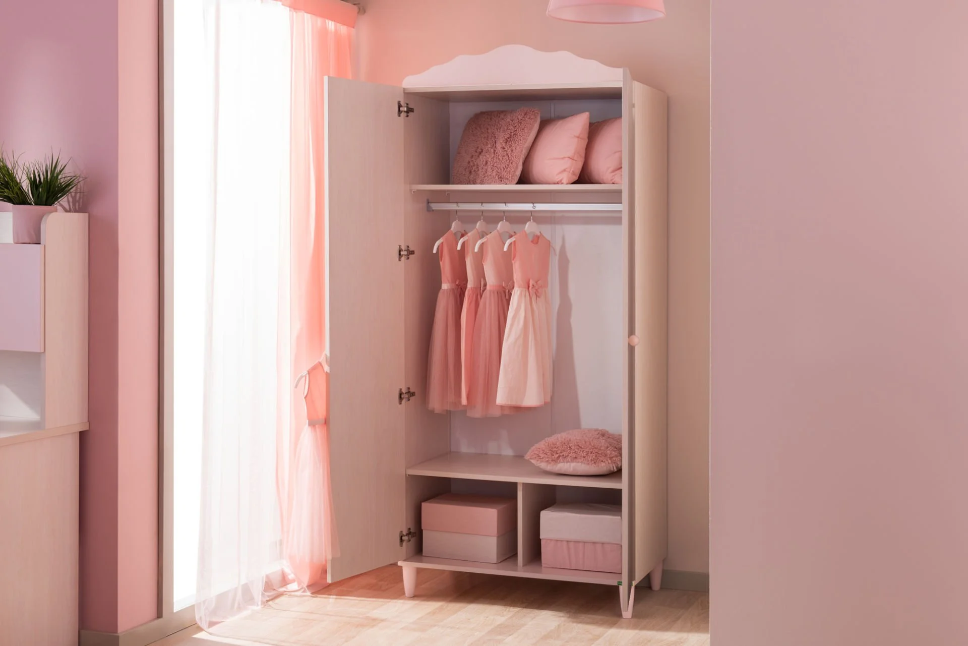 Otroška garderobna omara Poly iz linije otroških sob združuje sodoben dizajn, varne materiale in premišljene funkcionalnosti. Dvokrilna omara z vrati z mehkim zapiranjem in vgrajeno LED osvetlitvijo ponuja optimalno preglednost in varno uporabo tudi za najmlajše.