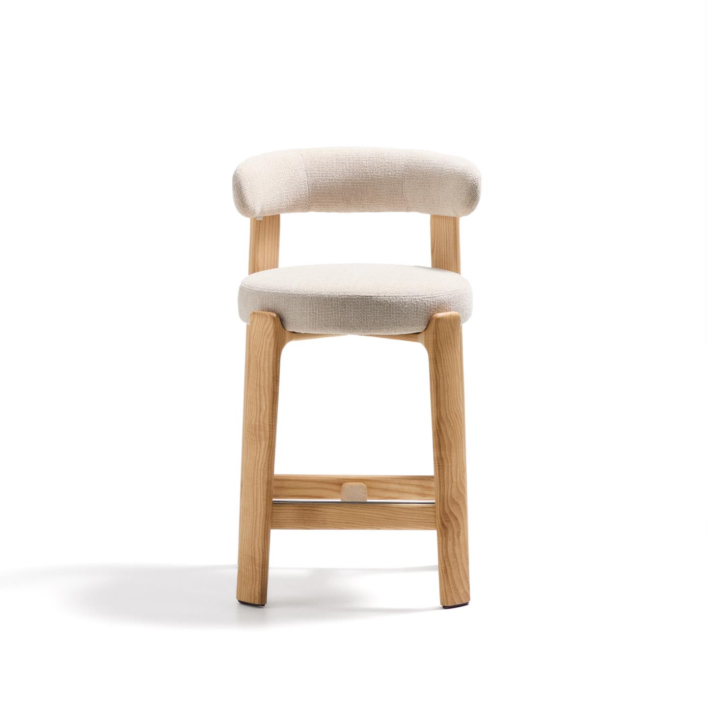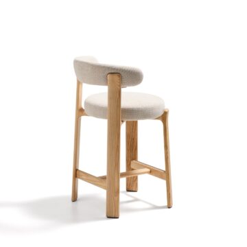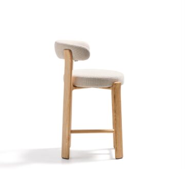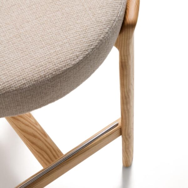 Materiali: glavni material masiven les, sestava 50 % jesen (Fraxinus Excelsior), 24 % tkanina, 17 % PU pena (poliuretan), 6 % aluminij, 3 % nizkoemisijski vezan les razreda E0, konstrukcija okvirja jesen, zaključna obdelava NC, materiali sedišča jesen, tkanina, PU pena, kovina in vezan les E0, materiali naslona PU pena, vezan les E0 in tkanina, tip blaga chenille, sestava blaga 75 % poliester in 25 % recikliran poliester, gramatura 450 g/m², polnilo oblazinjenja pena z gostoto 65 kg/m³, odpornost na obrabo nad 75.000 ciklov Martindale, odpornost proti muckanju 4 – zelo dobra, obstojnost barve na svetlobi 5 – zelo dobra, material nog jesen z zaključkom NC, drsniki iz plastike in filca, izdelano iz recikliranih materialov ne, izdelano iz naravnih materialov da, delež naravnih materialov več kot 25 %.