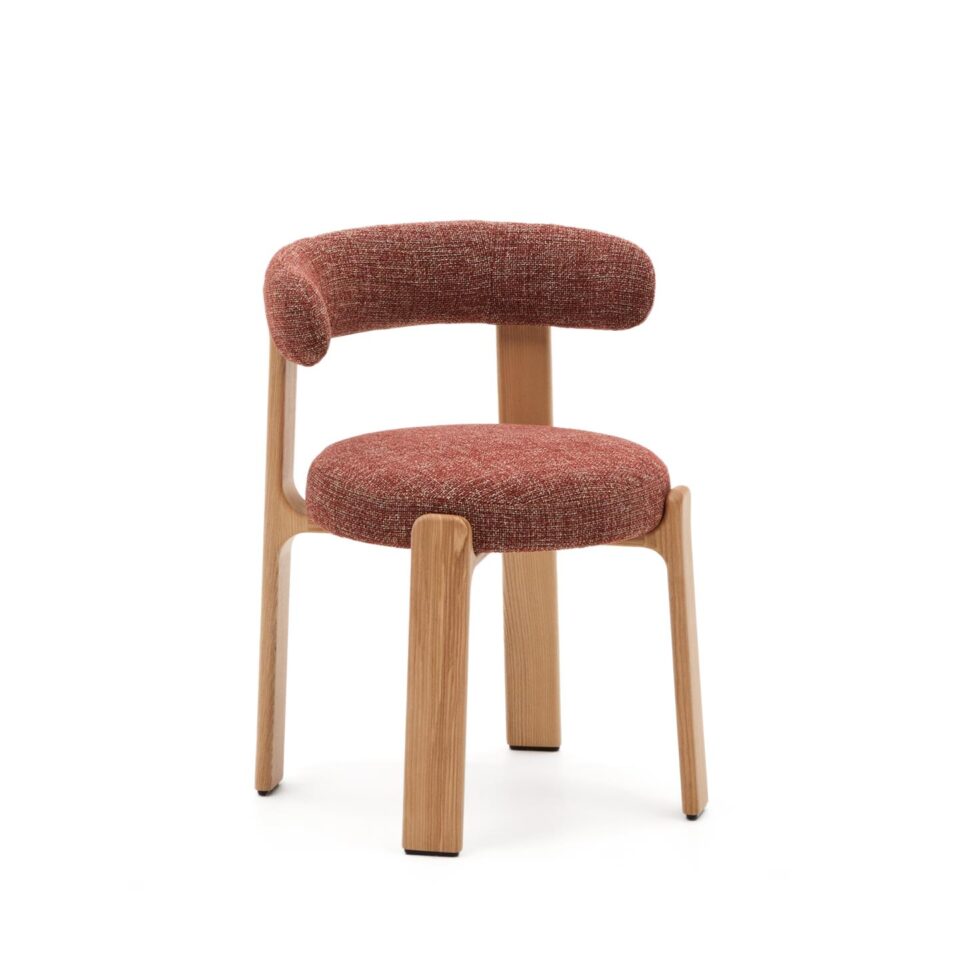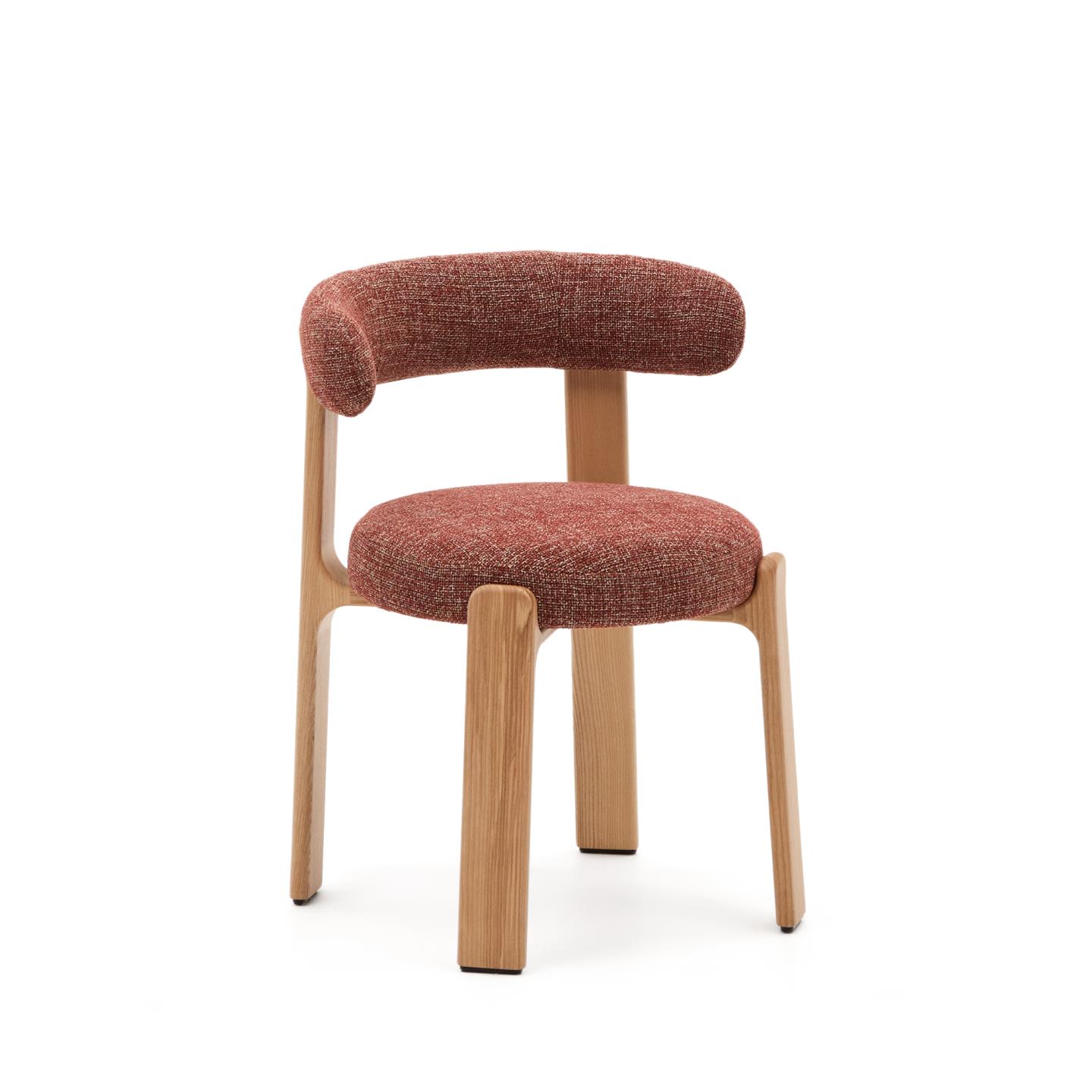 Stol je oblazinjen z debelo šeniljsko tkanino v terakota odtenku, izdelano tudi iz recikliranega poliestra. Noge so iz masivnega jesenovega lesa v naravni barvi. Tkanina ima certifikat za okolju varno in odgovorno proizvodnjo ter je narejena iz certificiranih recikliranih materialov, kar zmanjšuje vpliv na okolje. Les izvira iz odgovornega gospodarjenja z gozdovi in ima 100 % FSC™ certifikat sledljivosti.