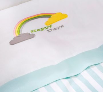 Posteljnina Happy Days je narejena iz najboljšega bombaža in je sestavljena iz prevleke za vzmetnico, zaščitne ograje, pregrinjala in prevleke za vzglavnik. Nežni toni in okrasno vezenje ji dajejo poseben čar.