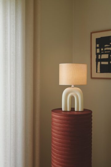 Namizna svetilka Haze združuje elegantno obliko s čudovito mešanico keramike in platna, kar ustvarja prijetno in udobno svetlobno atmosfero. Njena oblika spominja na mavrico v nežni bež barvi, kar je idealno za vsak prostor, kjer potrebujete prijetno osvetlitev.