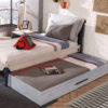 Izvlečna postelja Trio je na voljo v svetlo modri barvi z ročajem v temnejši barvi. Ob nakupu vzmetnice velikosti 90 x 190 cm imate zagotovljeno dodatno udobno ležišče. Če pa potebujete več shranjevalnega prostora, pa jo lahko uporabljate kot predal.