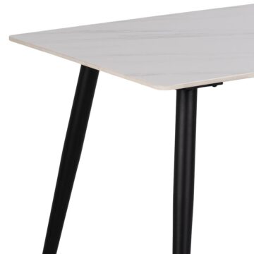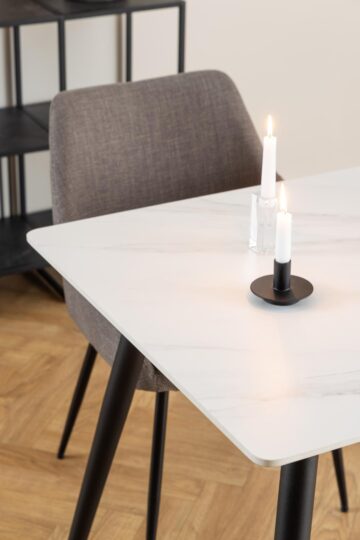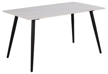 Jedilna miza Wicklow prinaša sodoben, izčiščen dizajn, ki združuje estetiko in praktičnost. Površina mize je izdelana iz mat bele keramične plošče debeline 12 mm, z elegantnim marmornim tiskom, ki dodaja pridih luksuza vaši jedilnici. Keramična površina ni le lepa, temveč je tudi izjemno trpežna, saj je odporna na toploto in praske ter zahteva minimalno vzdrževanje. Kot kontrast svetli površini so noge mize zaobljene in izdelane iz črnega mat praškasto premazanega jekla, kar dopolnjuje sodoben videz.