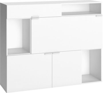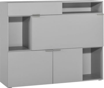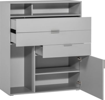 Jedilniško pohištvo 4You je narejeno iz oplemenitene iverne plošče, ki je zaščitena z melaminsko zaščito bele ali svetlo sive barve.Vsa vrata in predali se mehko zapirajo.