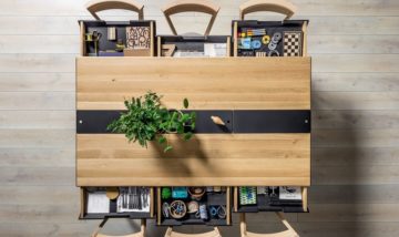 Inovativno jedilniško mizo Nature odlikuje praktična funkcija. Miza ima kar šest predalov in predel za shranjevanje na sredini mize. Sredinski predel se lahko uporablja za shranjevanje, ali pa za odlaganje posode, saj so odstranljive kovinske plošče odporne na visoko temperaturo.