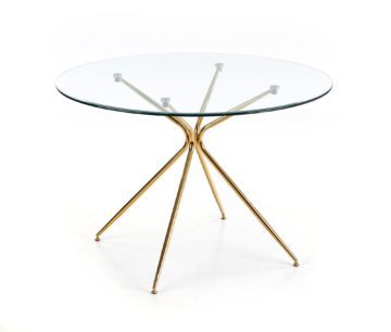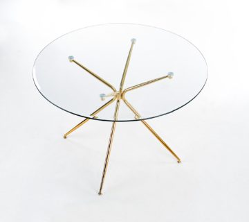 Okrogla jedilniška miza Rondo se lahko pohvali s kromiranim podnožjem obarvanim v zlato barvo. Tovrstno jekleno podnožje doda prav poseben šarm k celotni podobi jedilniške mize, ki je okrogla in vsebuje stekleno zgornjo površino.