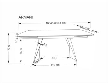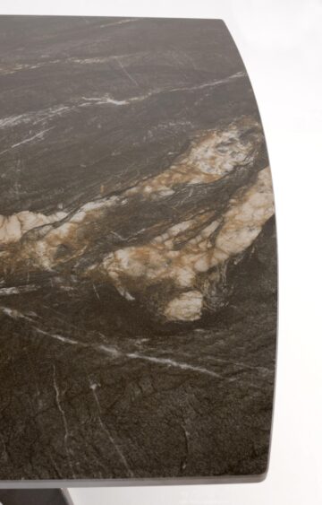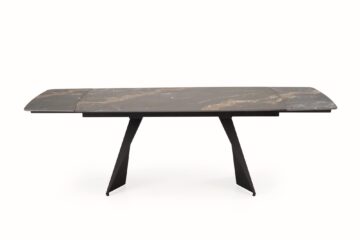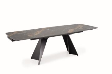 Miza Armani izstopa s ploščo iz sintranega kamna v črnem marmorju, ki navdušuje z edinstvenim vzorcem in mat zaključkom. Poleg prestižnega videza zagotavlja tudi izjemno odpornost na praske, toploto in vsakodnevno obrabo. Kovinske noge iz črnega prašno barvanega jekla prispevajo k stabilnosti in sodobnemu videzu. Raztegljiv mehanizem omogoča enostavno podaljšanje mize do 241 cm, kar jo naredi popolno tako za vsakodnevno uporabo kot za posebne priložnosti.