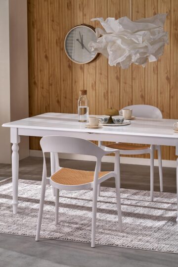 Jedilniški set Nelson združuje eleganco skandinavskega oblikovanja s praktičnostjo za vsakodnevno uporabo. Bela barvna shema, zaobljene linije in preprosta estetika ustvarjajo harmoničen ambient, ki se brezhibno prilega sodobnim, rustikalnim in skandinavsko navdihnjenim interierjem.