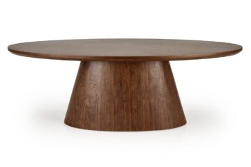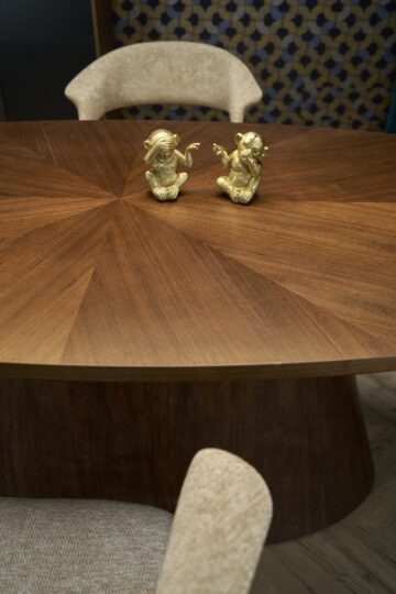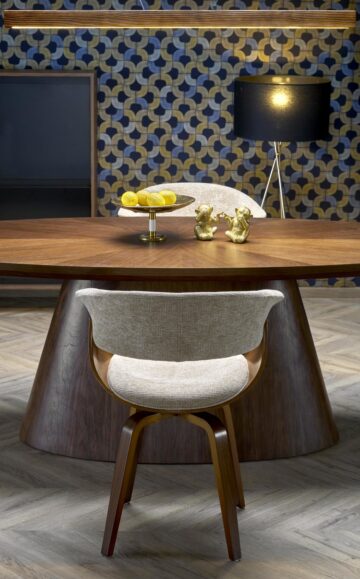 Jedilniški set Vagner navdušuje z uravnoteženo kombinacijo sodobnega dizajna, kakovostnih materialov in prefinjene estetike. Ovalna miza z masivnimi stožčastimi nogami izstopa kot osrednji kos prostora, ki vnaša toplino oreha in oblikovno drznost v vsako jedilnico.