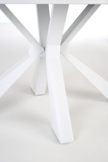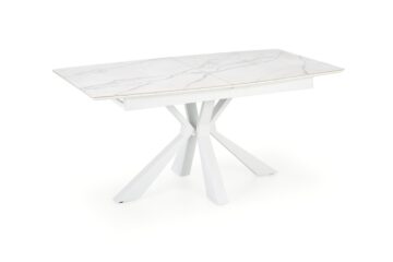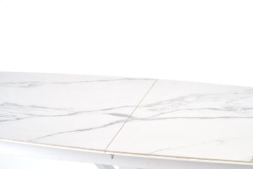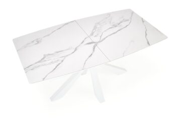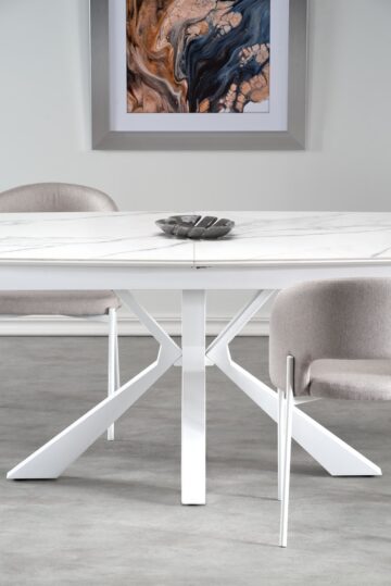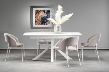 Miza Vivaldi se ponaša z raztegljivo mizno ploščo iz sintranega kamna in lakiranega MDF-ja, ki vizualno posnema beli marmor. Mat površina doda občutek prefinjenosti, visoka odpornost materialov pa zagotavlja dolgo življenjsko dobo in enostavno vzdrževanje. Konstrukcijo dopolnjujejo stabilne kovinske noge v beli barvi, ki subtilno podpirajo celoten videz mize in prispevajo k svetlemu ambientu prostora.