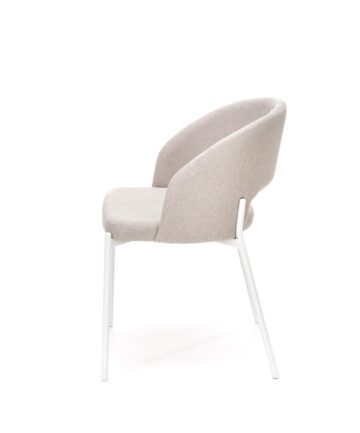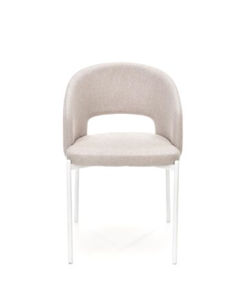 Stoli v kompletu so tapecirani z mehko tkanino v bež odtenku ter opremljeni z belimi kovinskimi nogami okroglega prereza. Njihova kompaktna oblika in nevtralna barvna kombinacija se harmonično povezuje z estetiko mize, hkrati pa nudijo udobno sedenje.