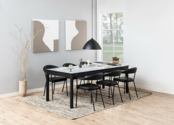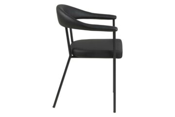Jedilniški stol Ava je dobavljiv v črnem umetnem usnju. Stol je klasičnega videza. Podnožje stola je prašno lakirano črne barve