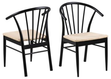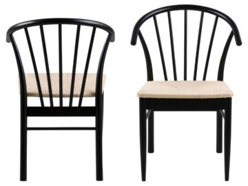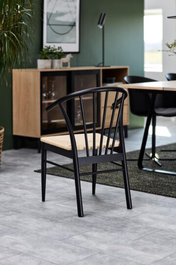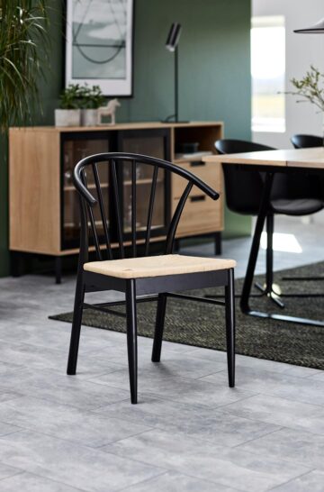 Navdahnjen s skandinavskim stilom bo hrastov jedilniški stol Cassandra z naslonjali za roke, lakiran s črnim lakom, hitro postal najljubši sedež v hiši. Naslonjalo ukrivljene oblike ne nudi le opore za vaš hrbet, ampak služi tudi kot zanimiv vizualni element. Sedišče stola je iz pletenih niti.