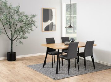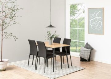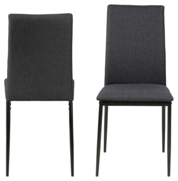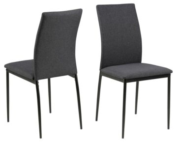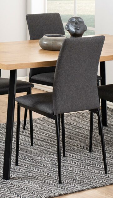 Jedilniški stol Demina se s svojim preprostim dizajnom sklada s skoraj vsako jedilniško mizo. Sedišče je narejeno iz Sawana tkanine v sivi barvi. Podnožje je kovinsko in prašno barvano v črno barvo.