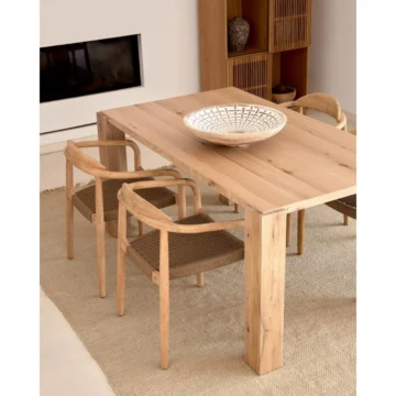 Jedilniški stol Glynis je mladostnega videza, primeren za moderne in klasične jedilnice. Stol je dobavljiv je v bež in sivi barvi ter je narejen iz evkaliptusovega lesa. Sedišče je iz pleteno iz vrvi.