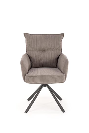 Stoli K528 v kapučino ali sivi barvi so oblazinjeni z mehkim blagom iz kolekcije Kord in stojijo na črnem kovinskem ogrodju. Ergonomska zasnova z dodatno funkcijo vrtenja za 180° prinaša maksimalno udobje in gibljivost, kar jih naredi idealne za vsakdanjo uporabo ali dolga druženja.