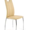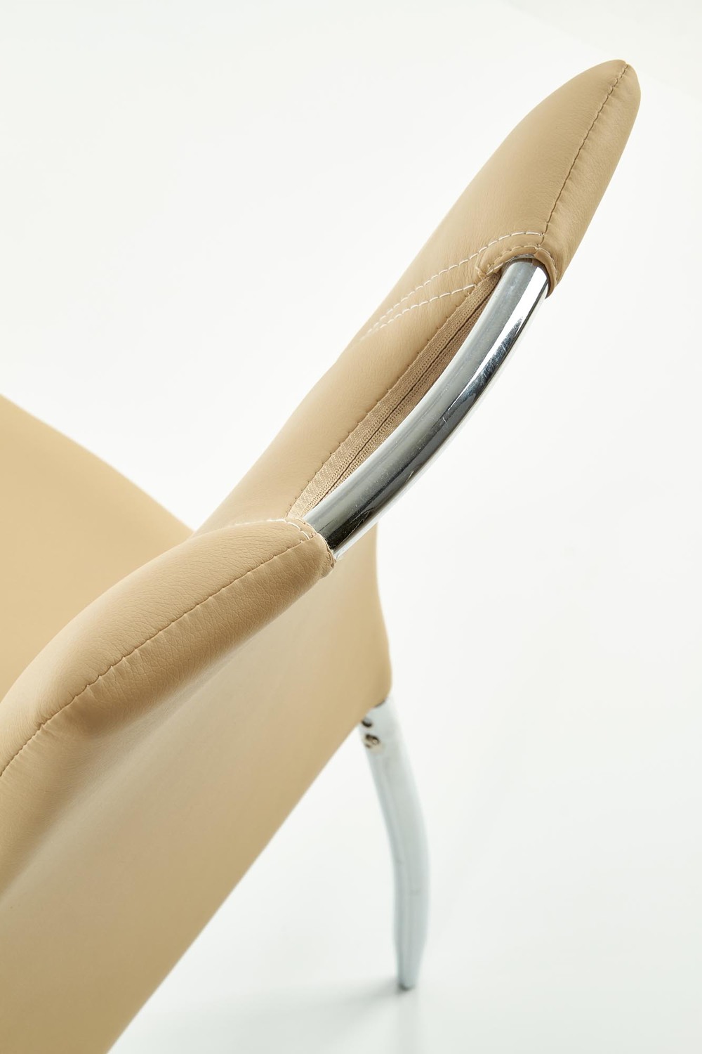 Jedilniški stol K187 je dobavljiv iz kromiranega jekla. Sedišče je narejeno iz ekološkega usnja.