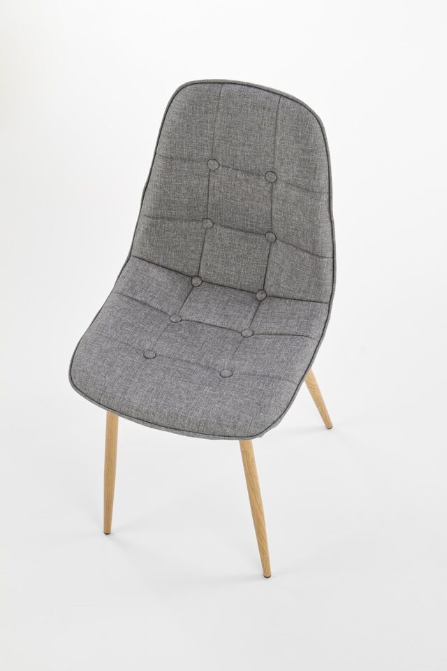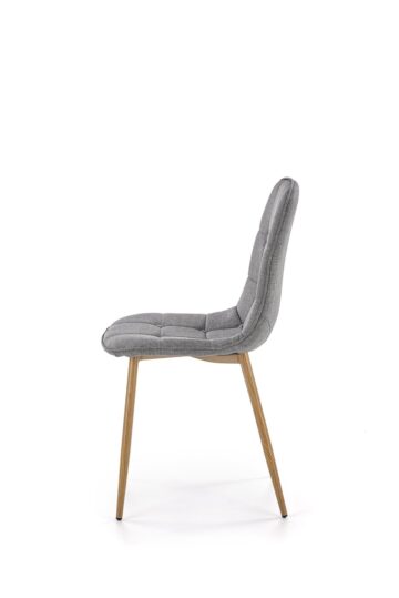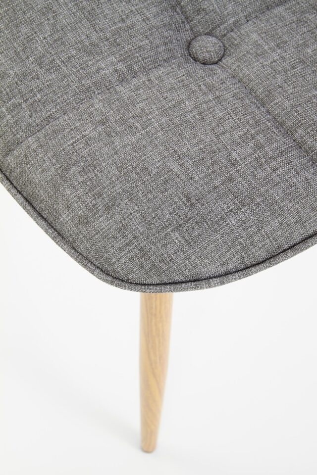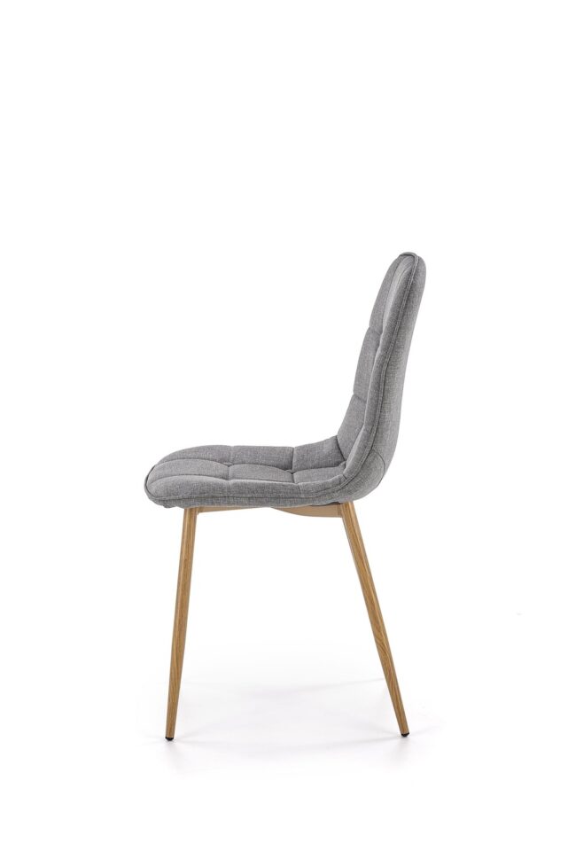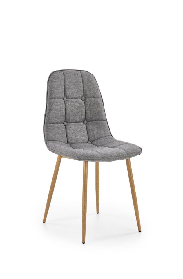 Jedilniški stol K316 združuje tradicionalno eleganco in sodobno funkcionalnost. Oblazinjen sedež v sivi tkanini zagotavlja prijetno udobje pri sedenju, medtem ko noge v odtenku medenega hrasta prostoru dodajo toplino in klasičen videz.