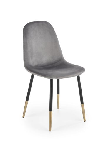 Jedilniški stol K379 je izdelan iz plišaste tkanine, prijetne na otip in kovinskega podnožja, obarvanega v črno barvo z pozlačenimi obrobami. Jedilniški stol je na voljo v treh barvah: