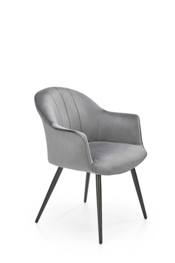 Udoben večnamenski stol z naslonom za hrbet in roke. Estetskega videza, z zaobljenim sediščem in črnimi nogami. Iz žametne tkanine in praškasto lakiranega jekla.