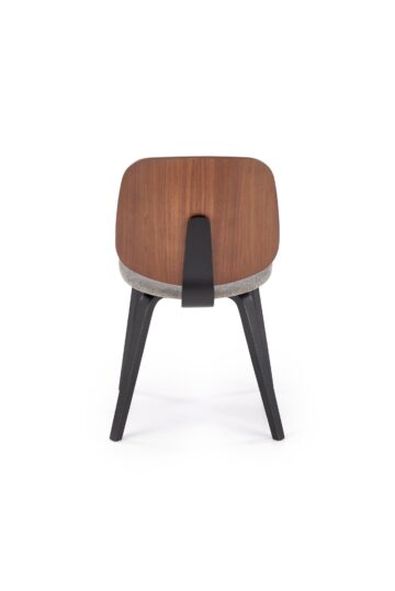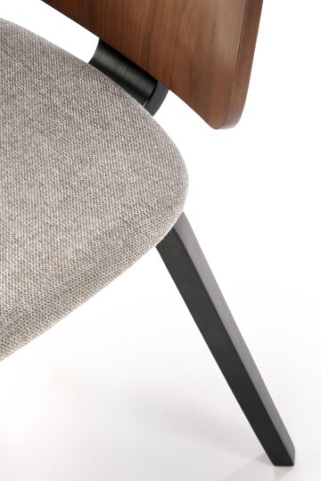 Sodoben jedilniški stol “K563” je izdelan z mislijo na trajnost in udobje. Ogrodje stola je iz trdnega kavčukovega lesa z elegantnim orehovim finišem, ki mu daje topel in privlačen videz. Sedišče je izdelano iz upognjene vezane plošče, oblazinjeno z mehkim sivim blagom, ki zagotavlja udobje tudi pri daljšem sedenju. Noge stola so pobarvane v črno barvo, kar ustvarja sodoben in estetsko privlačen kontrast. Stol “K563” je idealna izbira za vsak sodoben jedilni prostor, saj združuje funkcionalnost s stilom.