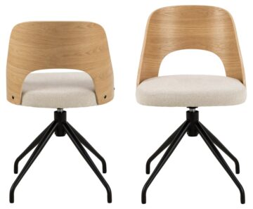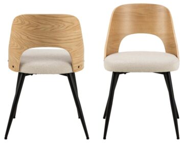 Jedilni stol Lucy združuje klasični in skandinavski stil. Hrbet stola je zaobljen in izdelan iz hrastovega furnirja, sedišče stola pa je oblazinjeno in preoblečeno z bež trpežno tkanino. Črne kovinske noge pa dopolnjujejo videz jedilniškega stola.