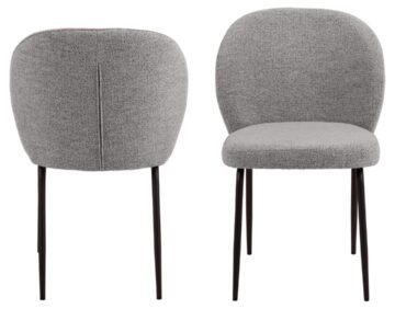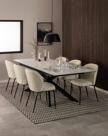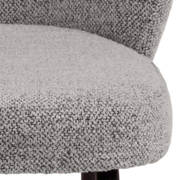 Naj bo vaša jedilnica še nekoliko bolj elegantna z jedilniškim stolom Patricia. Zaobljena hrbtna stran ni le elegantna, ampak vas bo podpirala tudi med številnimi prijetnimi večerjami s prijatelji in družino. Za moderen videz bo poskrbela mehka tkanina iz bukleja.Podnožje stola je narejeno iz jekla prašno lakiranega z mat črno barvo.